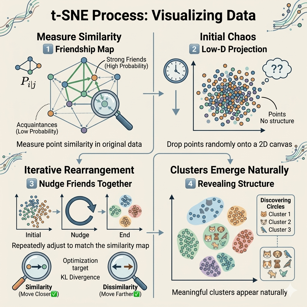 Instead of preserving overall geometry like PCA, t-SNE focuses on one mission: similar points should stay close together.