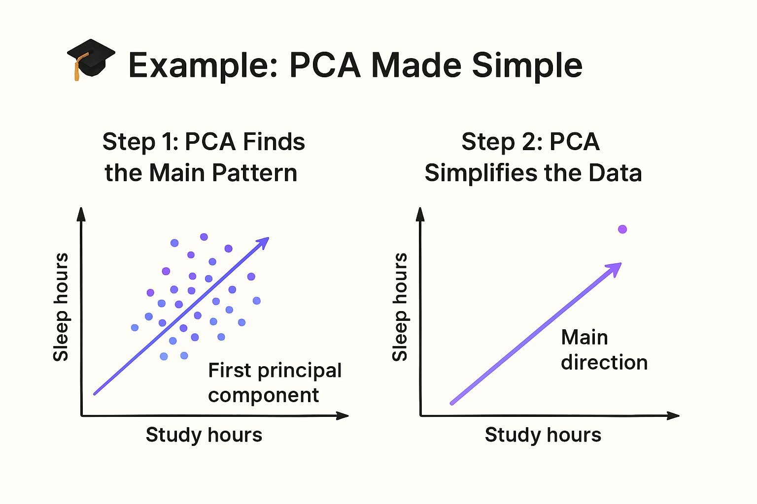 Instead of keeping both features (study hours and sleep hours), PCA lets you keep just that one main direction — the “study-sleep tradeoff” — while still capturing most of the information.