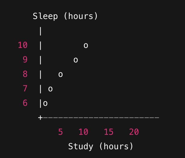You’ll notice the points form a slanted cloud — students who study more tend to sleep less.