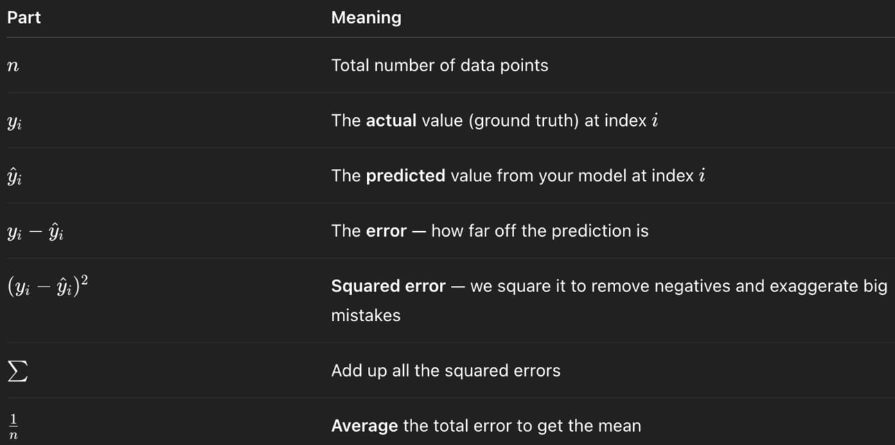 MSE is the brains commonly used behind the loss function. Despite how it looks, what it calculates is actually quite simple: how far off the model’s guess was.