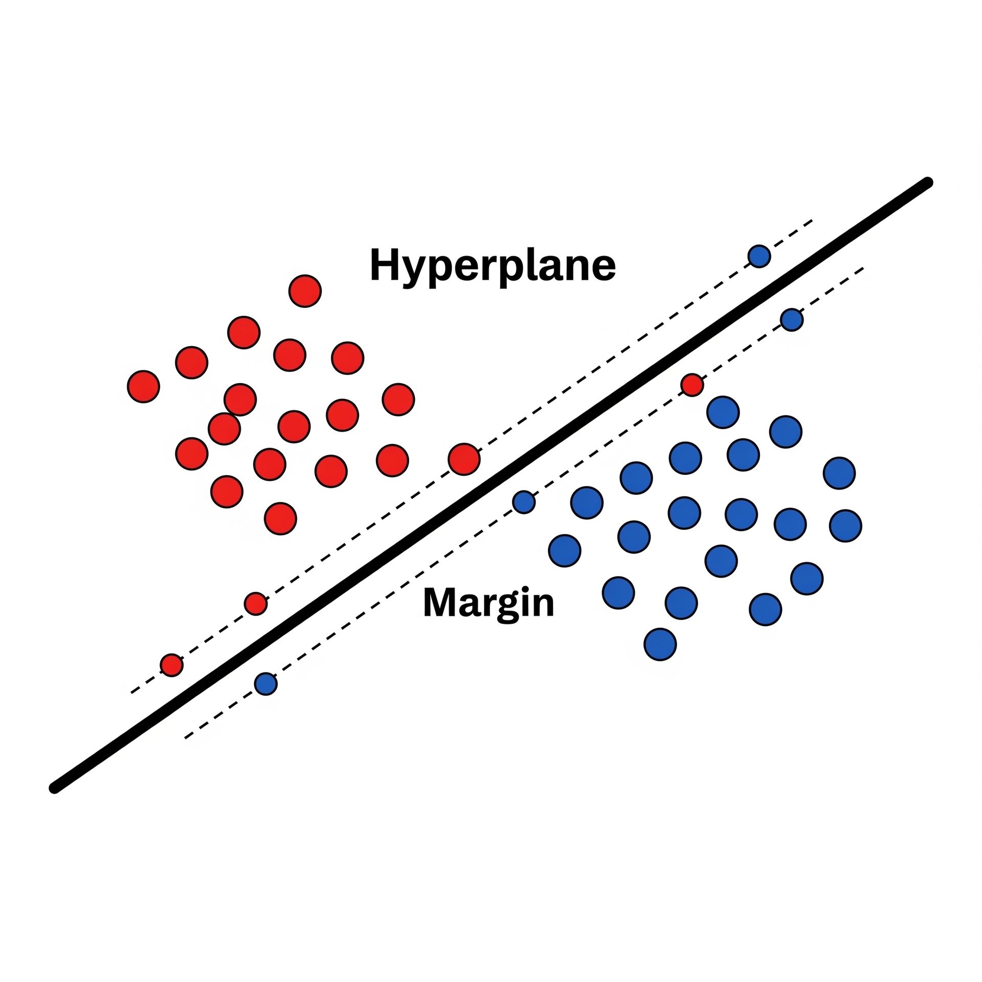 That magic line is called a hyperplane. The breathing room is called the margin.